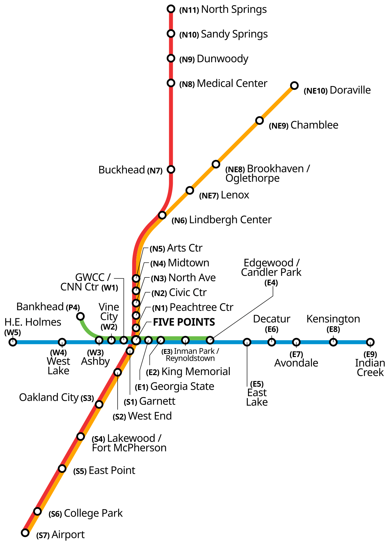 Large detailed map of the Atlanta metro system in the United States, with station names and metro line numbers.