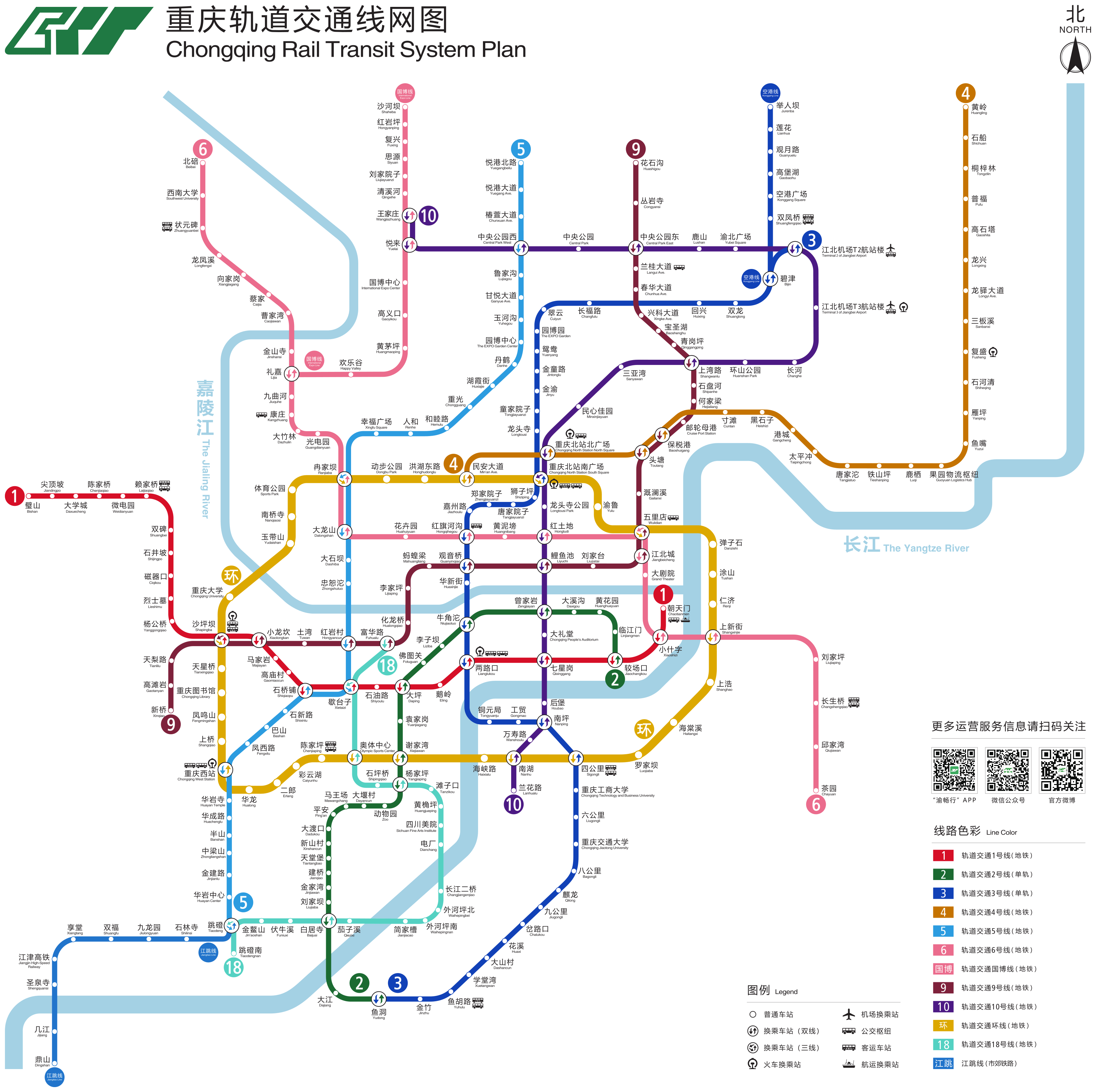 A large, detailed map of the Chongqing metro in China with all lines and station names in the city.