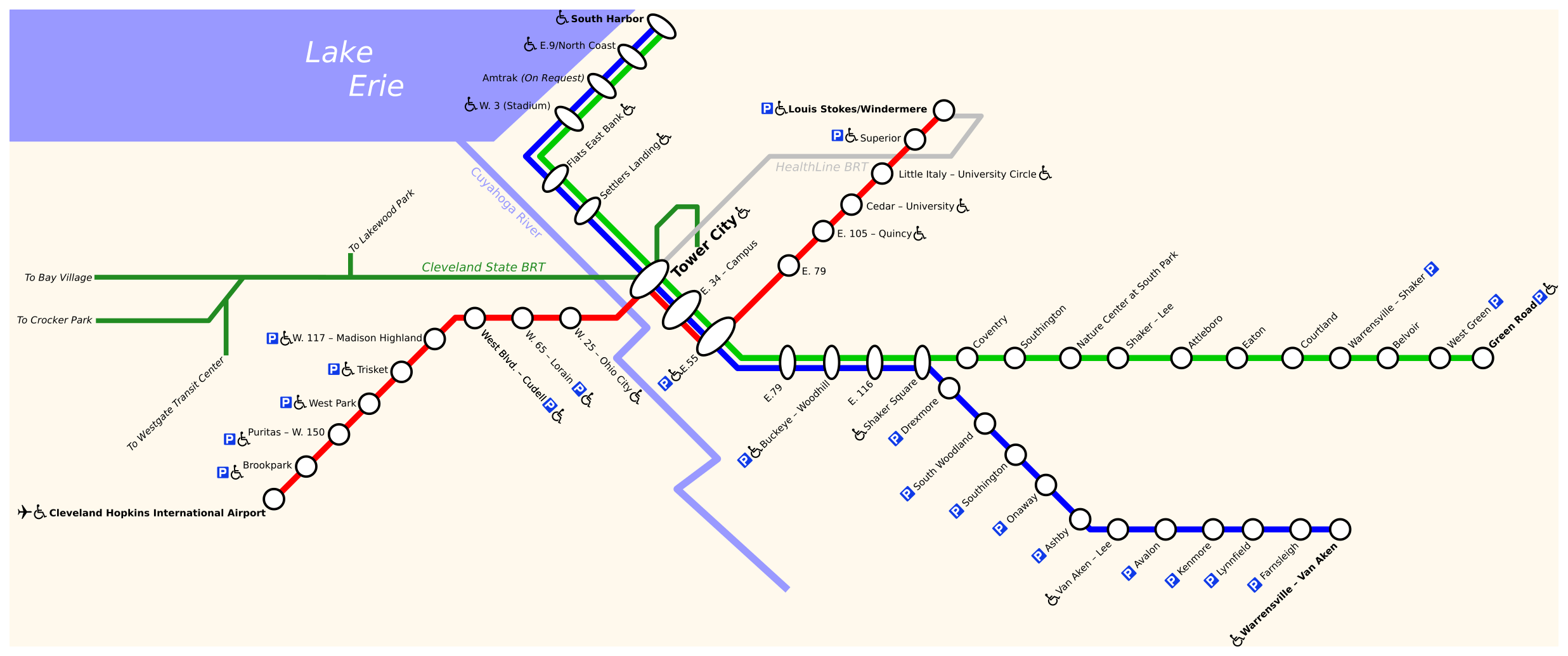 A large map of the Cleveland metro system in the United States, showing all lines and station names. Detailed maps of metro systems in cities across the United States.