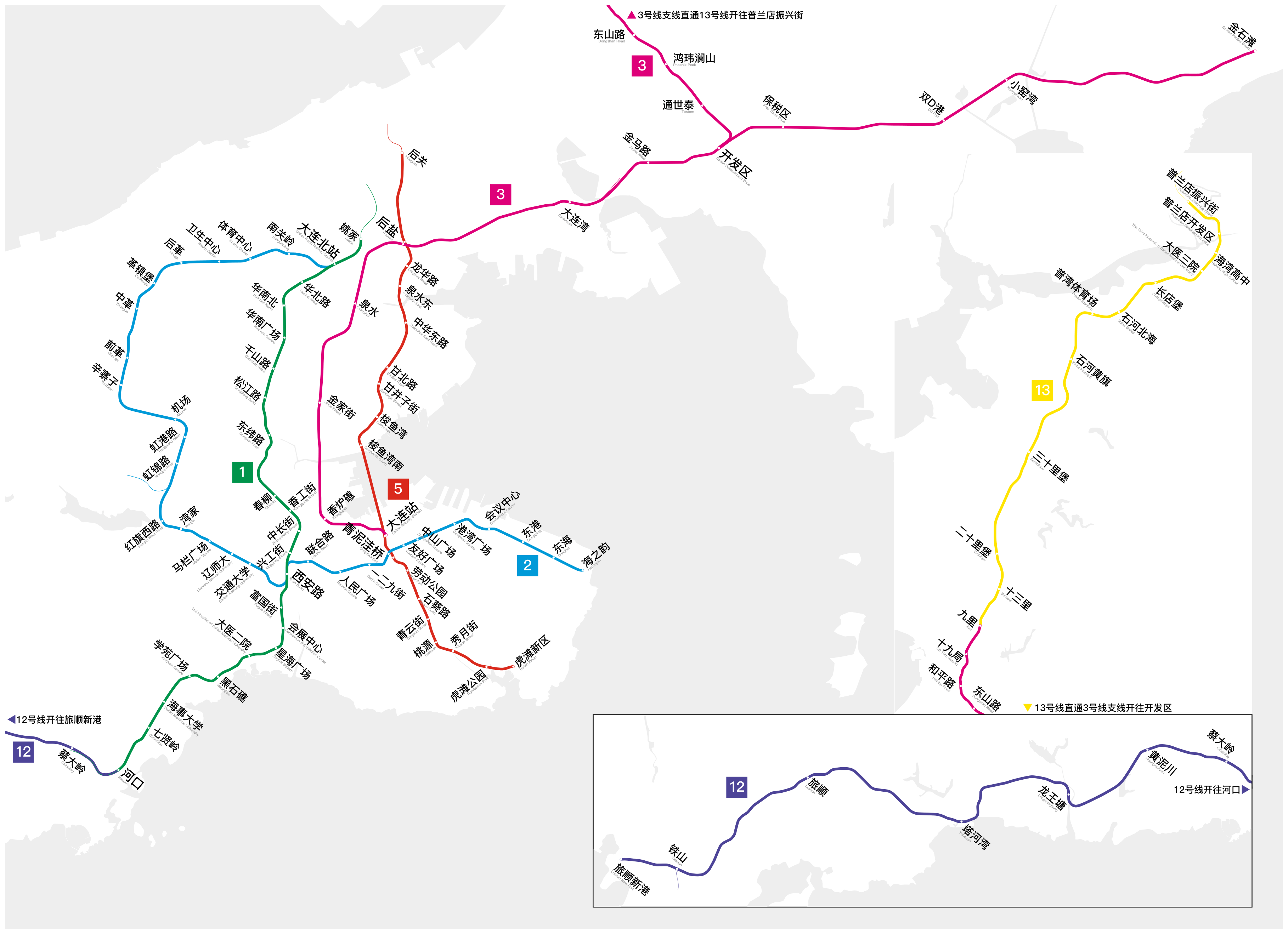 A large, detailed map of the Dalian metro system, a city in China. A map of the Dalian metro system with all lines and station names in the city written in Chinese and English.
