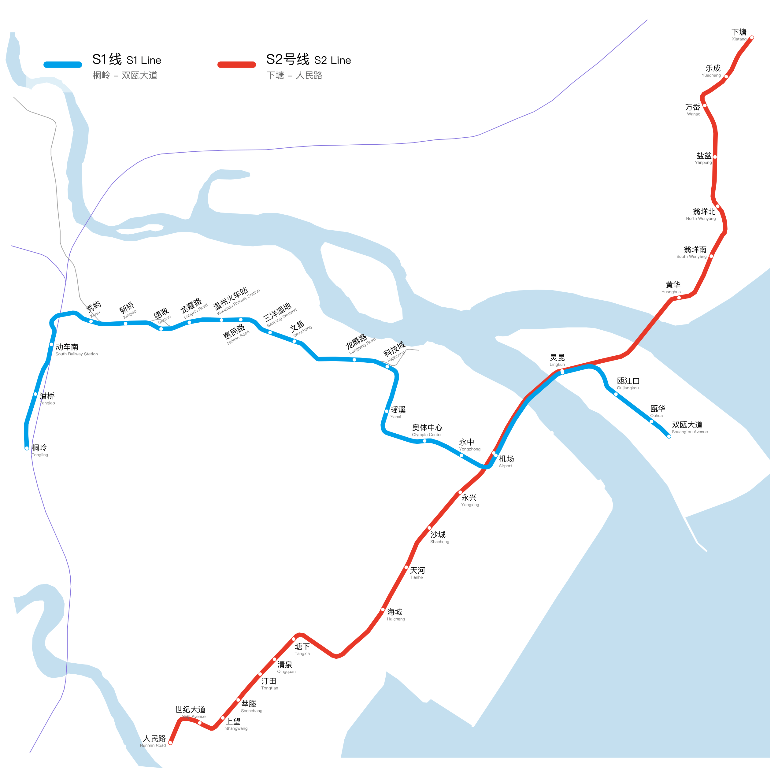 A large map of the Wenzhou metro in China, showing the city's two metro lines. The map also shows the names of each Wenzhou metro station in Chinese and English.