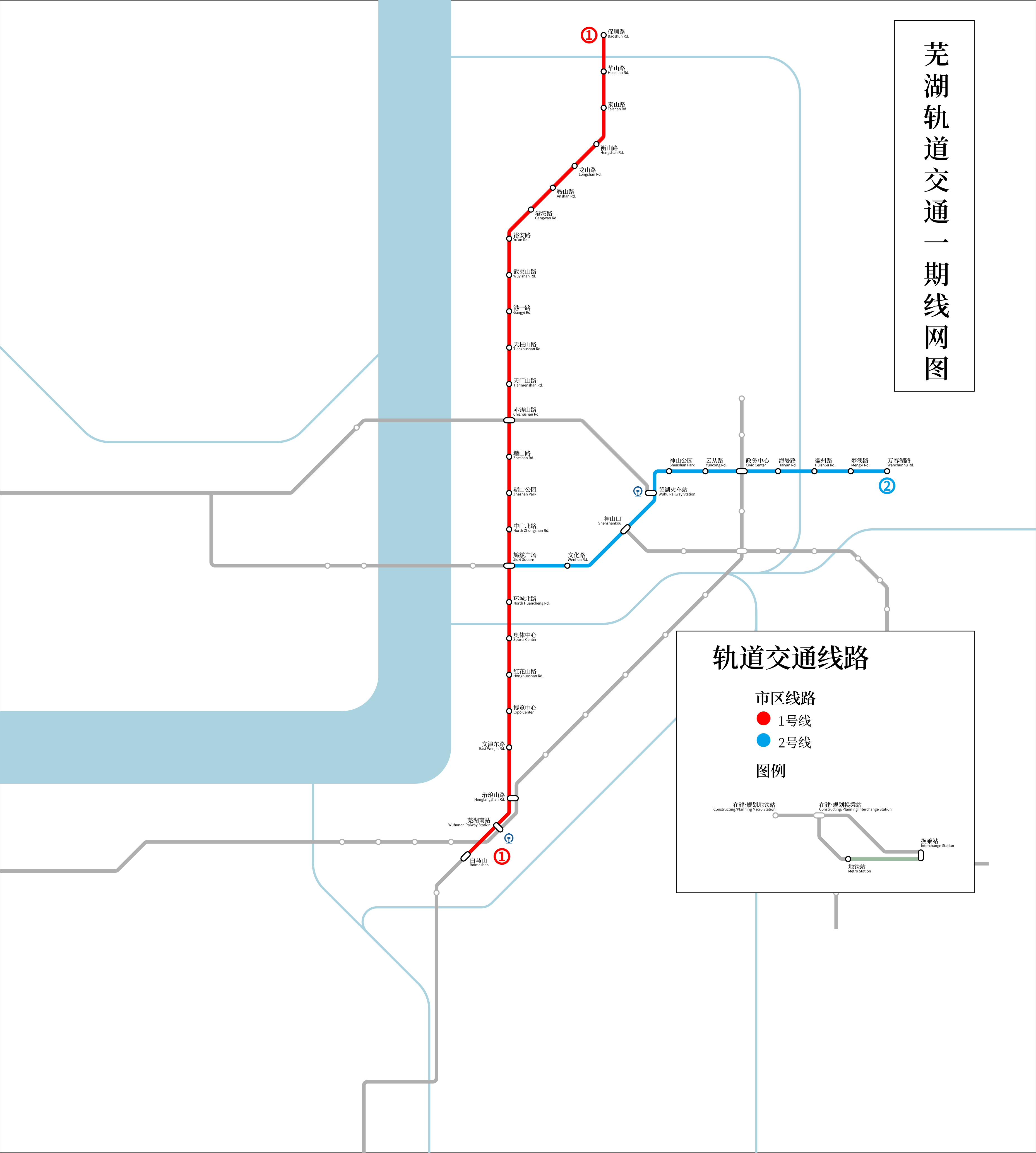A large map of the Wuhu metro system, a Chinese city. The map is accurate and lists the names of all stations on the city's two metro lines in Chinese and English.