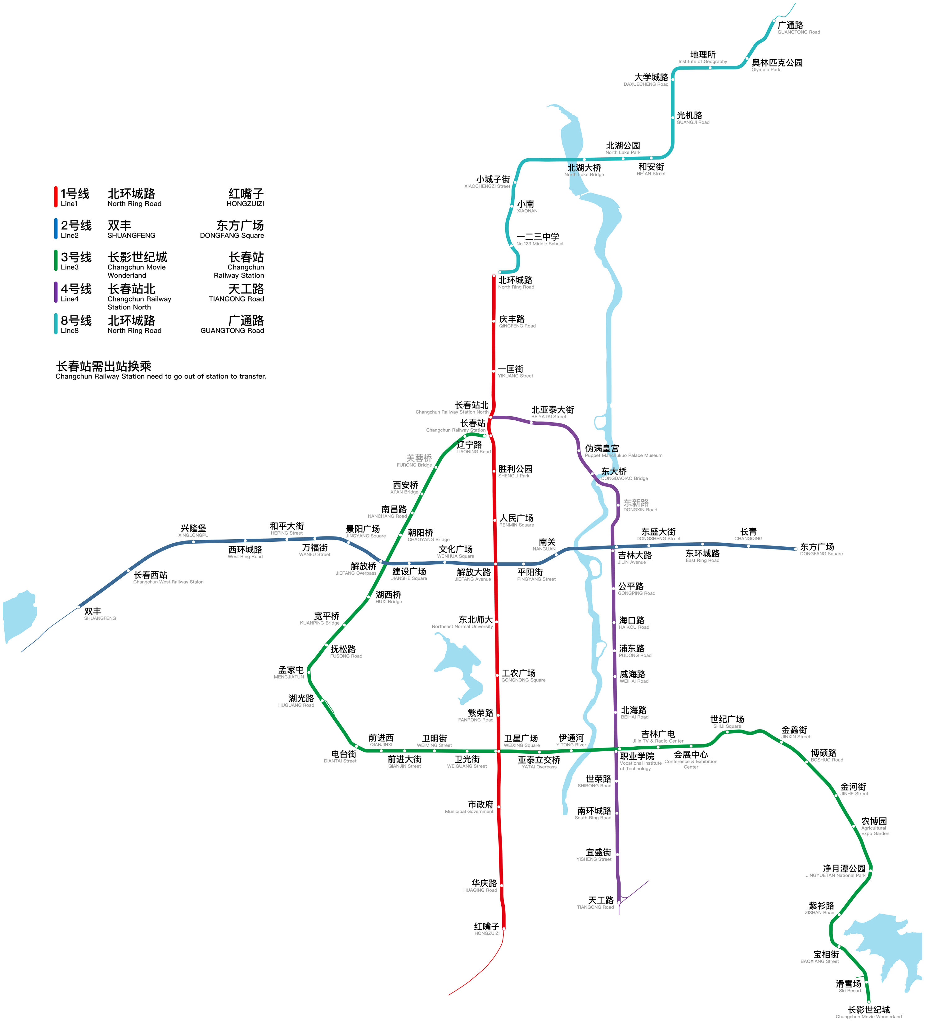 A large map of the Changchun metro system in China. The map details all the city's metro lines and stations. Line and station names are written in both English and Chinese.